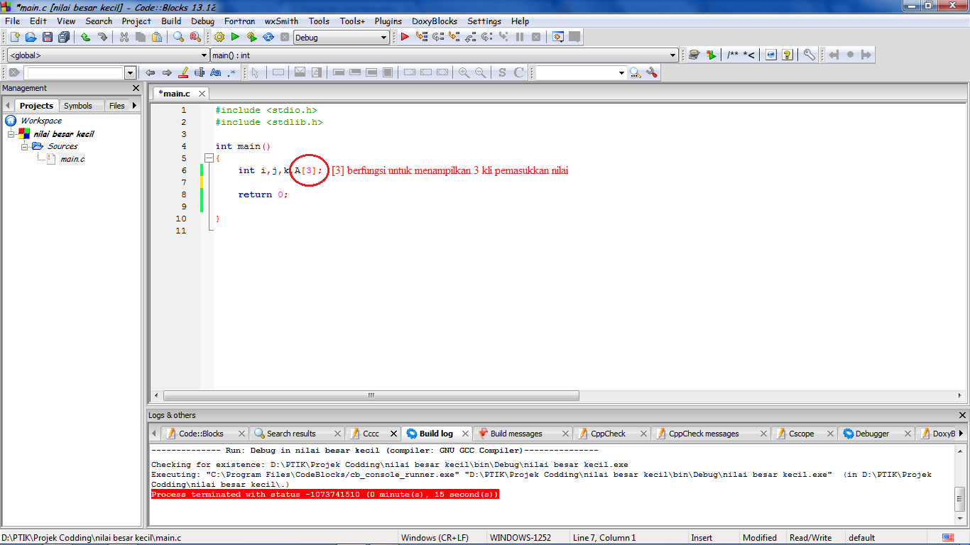 2. masukkan int i, j, k, A[3] seperti gambar di bawah ini;